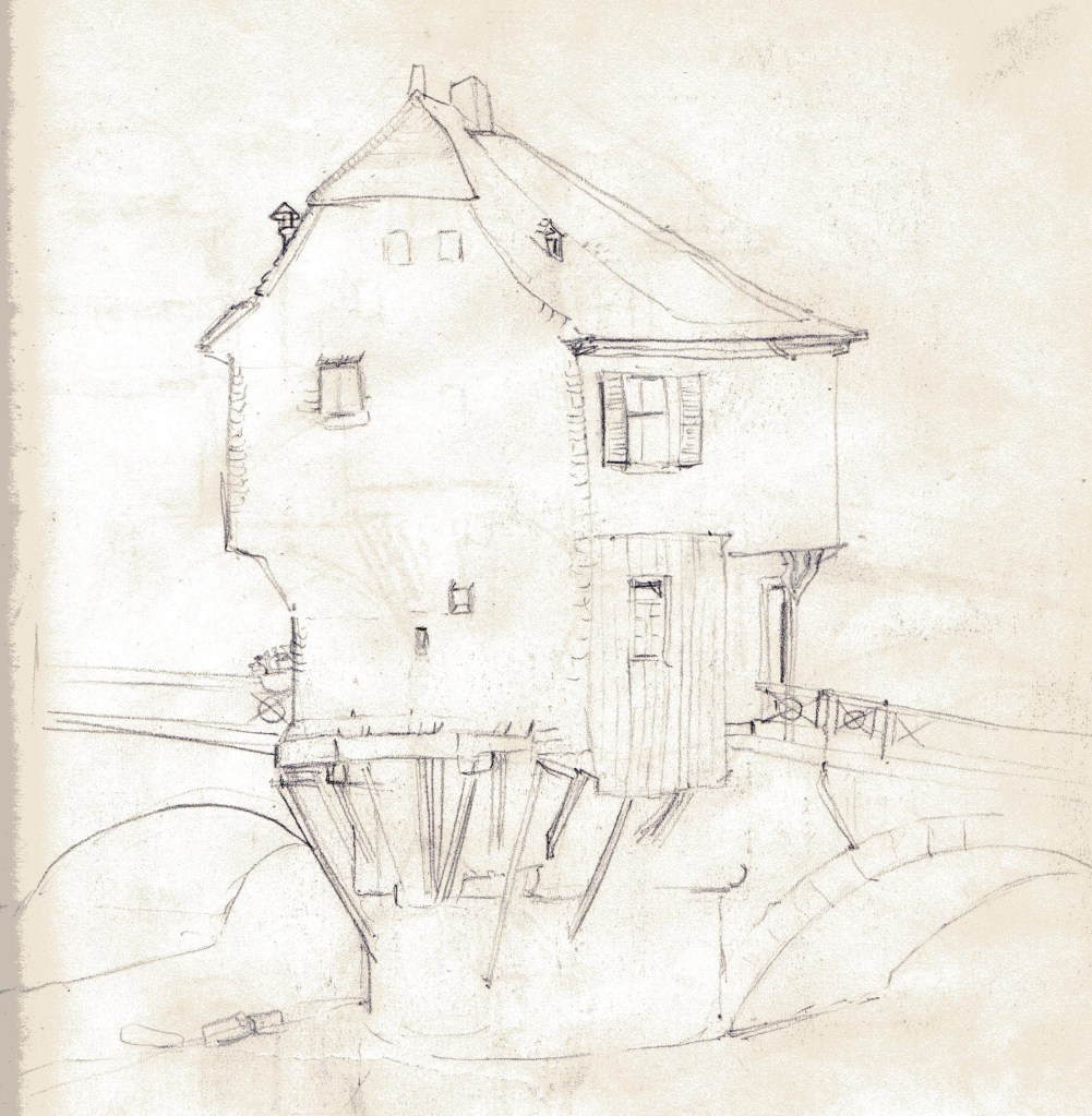 Würzburg, with my grandmother and aunt, and the places my mother grew up in, came next. On the way, we went through rain and mists. The steam from the train rushed to the ground and tried to embrace the near trees and houses but try as it might, it vanished always just before reaching its goal. Through dark hills and valleys where mists rise from each vale, silhouetting endless groups of dark pointed firs. Traveling alone by train I once more became a watcher. I was also aware that in this cold and rainy weather my clothes were not nearly warm enough – in NY one is never outside long enough to need real protection, but here it is all day out in the wind.