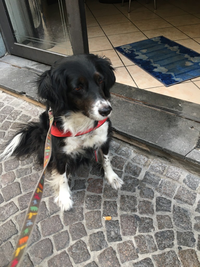 Morning walk. Ten o’clock. She, meaning Teah the dog, jumps down from the bed and stands hopefully in the doorway. “Time for my second walk, for that cappuccino, so I can see what’s going on in the street. Besides which I like Anthony and the others who come sit outside the Blue Bar. I might even find a crumb somebody dropped.”