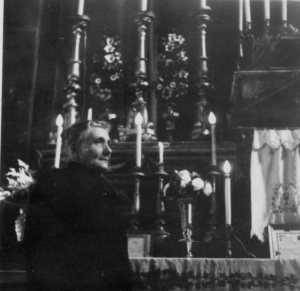 Former ruins had been brought back to life. A sense of pride prevailed and gave people a chance to live and find a purpose in their being. There was an old, an almost empty church in the center of the old city. The plain wooden doors opened from the piazza onto a sort of anteroom dominated by a life-sized figure of Saint Onofrio. He was in a glass case, surrounded by faded paper flowers and a few small votive candles, looking much like the shrine of a pagan idol. Thin arms and legs protruded from under the cloak of his own hair. He was holding a large brown beaded rosary and this was his church. A woman entered from the main part of the building, a black kerchief giving her fine old face great dignity as she told me of this, her church, with immense love. It had been abandoned and the people of the neighborhood refitted it and brought it back to life. The cover on the altar underneath the one with hand-painted roses was pure linen. The big carved table at the other end was 300 years old. She turned on all the lights for me and then led me by the hand to see the painting of the hermit’s death and another smaller miraculous statue. I wanted a photograph of her church and of her, but had to wait while she went to change into her more dignified, more impersonal self in a black coat and minus the scarf. She stood by the altar with a solemn, rather stiff, face as I took the picture. (picture of her) But it was not at all what I had wanted. They were a proud people, but they never could understand why I would rather have a picture of them in their working clothes, or of a crumbling ruin, a why that was never to be bridged.