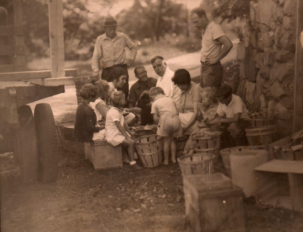 We had an orchard with over 80 trees on our 98-acre farm in Massachusetts. When harvest time came, my sister and I and the whole family went out to pick apples. My father had fixed the pick-up truck with a platform on the back and had invented picking bags, sort of like kangaroo pouches, that hung around our shoulders. Once filled, we would empty them into boxes to be stored in the cellar.