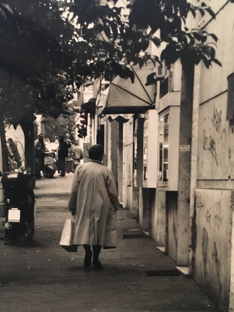 End of the line, Stazione Termini. Then, a quick walk across the square, hoping you won’t have to wait too long for the 64 bus to come trundling up to the first stop in its route. The beginning of the line. Always a seat – not just because I am white-haired, but because that is what it is, the beginning of the line. It might just as well have been the end, for any surviving passengers make haste to leave and catch their trains to somewhere. Through Roman traffic, past the Coliseum, past the Circo Massimo, across the Tiber, through Trastevere, up the hill. Once through the ancient gate, and it’s time to get up and hang on to the strap as the bus swerves sharply to the left, ready to jump off as soon as the corner bar looms into sight. It’s already open, but Carolyn won’t be there till later for the cappuccino and brioche she can’t do without. And, of course, her newspaper. Next to the bar, the Philippinos and Chinese at the pizza place are busy getting ready for the onslaught of students on their way to school. On down the street named after one of Garibaldi’s redshirts. You have to ring your way through two gates and then hope the elevator won’t stop at the wrong floor.