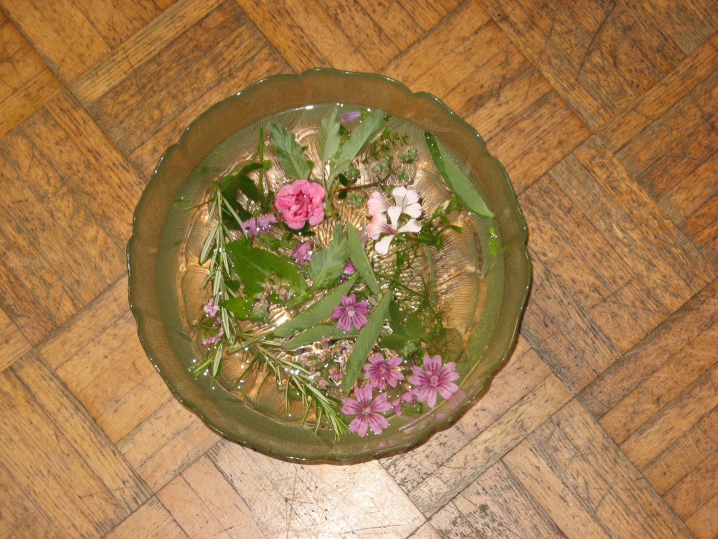 Before setting out though we have to wash our faces with the acqua odorosa, in which sprigs of rosemary, herba della Madonna (trust your botanist friend to identify the right one, Google in this case is no help), golden petals of the broom cloaking the hillsides (basketfuls will be used to carpet the streets with flower pictures over which the religious procession will pass later in the day), a few wild rose petals for color, malva, and sage, and whatever other fragrant leaves you could find, had been set out the night before, to be touched by the magical  rays of the moon.