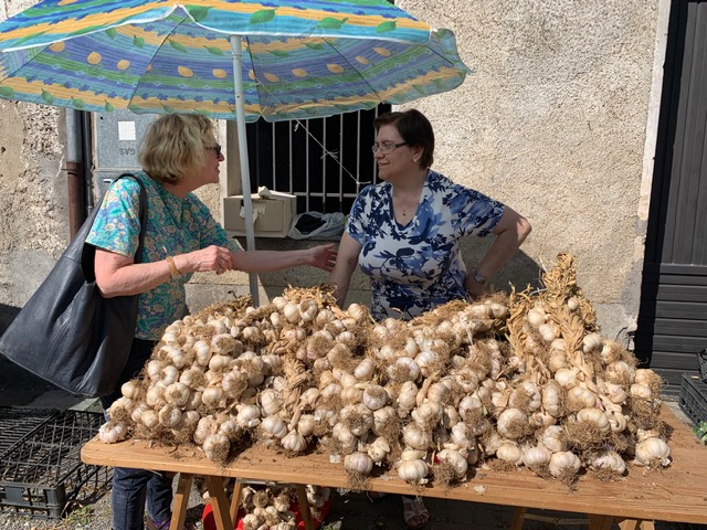 But we still have to buy our yearly supply of garlic – always making sure it is “red”, the cloves tinged pink.  The garlic heads are braided into ropes of various lengths, piled high on the small three-wheelers known as Ape parked here and there on the outskirts of the town.  Italian cooking wouldn’t be Italian without garlic, but my favorite recipe, aside from the bruschetta when the new oil comes in, is what we called Carolyn’s potion, infallible remedy for coughs and colds. We did have to convince my son to try it when he couldn’t get rid of his cold: Take 5 garlic cloves, peel and mince, cut very fine a finger of ginger root, boil in two cups water for 20 minutes. Strain (works best if put through a cloth so you can squeeze out all the juices), add juice of one lemon and a tablespoon of honey to each cup. Take for three days. Probably does help and doesn’t taste too bad. Nor does it leave you surrounded in an aura of garlic, like my German cousin who ate, I forget how many, cloves a day for her high blood pressure. Impossible to be in the same room with her.