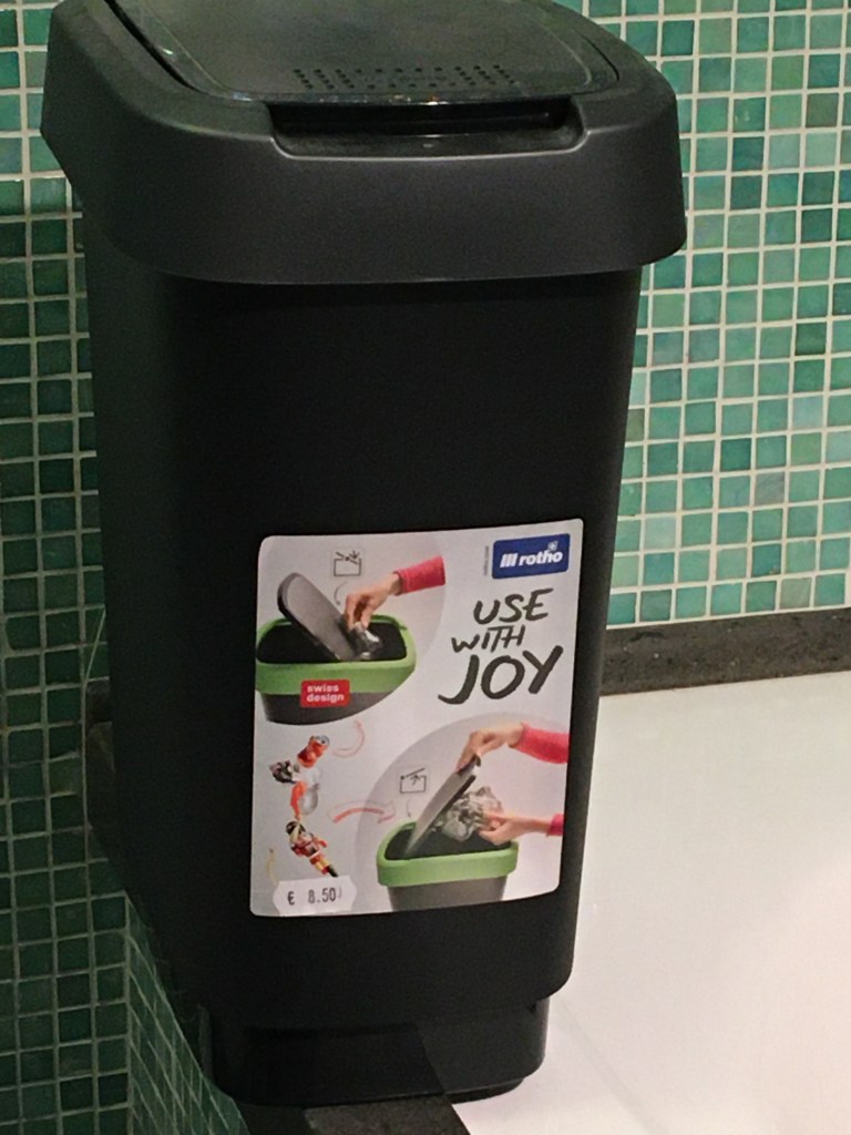 Still, I am puzzled by the Use with joy sticker and can’t help wondering whose idea it was to put it on a waste-paper container.