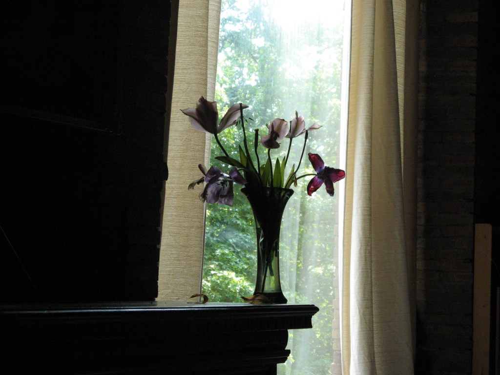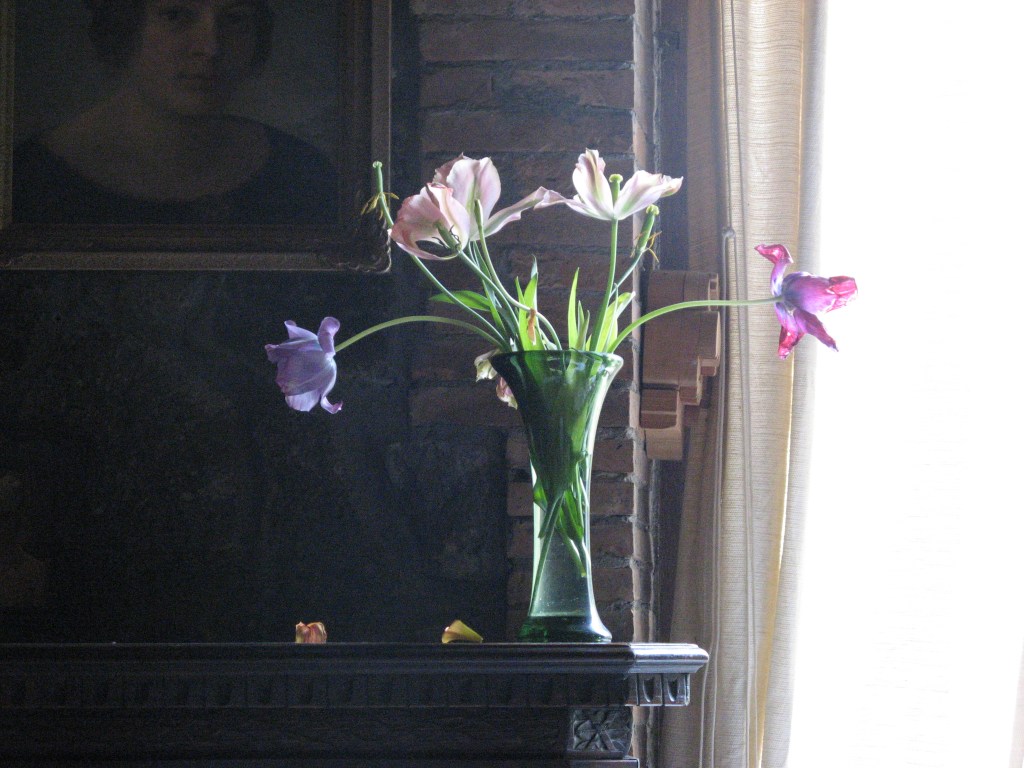 Oh, tulips! How I love them! And in all of their phases. Especially towards the end, when gravity takes its inevitable toll. But even after the petals fall, they can still have poignant color and shape. That’s my cue to let them dry and keep them as part of my life. À propos of that, I was glad I could enlarge the photo to see the beautiful portrait of your mother—another treasured memory.