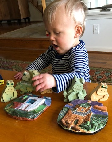 Soon, the young couple had a big garden and a cat and a baby boy named Charlie. Charlotte loved Charlie and wanted her frog families to sing, chortle, twitter, and cluck to him as they did to her, so she put them all together in Charlie’s room. She left the owls in her study. (Charlotte needed their wisdom to help her with her job teaching little kids to read). Evenings after story time, the frogs sang lullabies to young Charlie until he fell asleep. They told him stories about what went on with the cat while he was visiting Charlotte’s parents (his Zaidie and Omo) during the day. After a few months, Charlie began to chortle, and trill, and whisper, and sing to his frogs in their language – Then, in March, just before Charlie’s first birthday – what do you think happened? The pond frogs outside his bedroom window began to sing!
