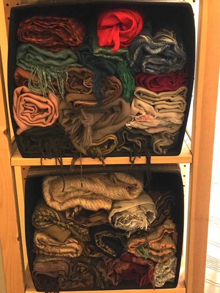 Many of my scarves were chosen for their color combinations, such as turquoise and lime, or tones of wine or pink and grey. Yet now looking over my many many shawls and scarves I find an impressive number very neutral in color – grey blending into black, or tan, or simply warm dove grey. All that with a mind to being “fashionable”, making sure the stole harmonized with my outfit. Counting them, I note there are over 24 stoles, carefully rolled up, in my storage space.