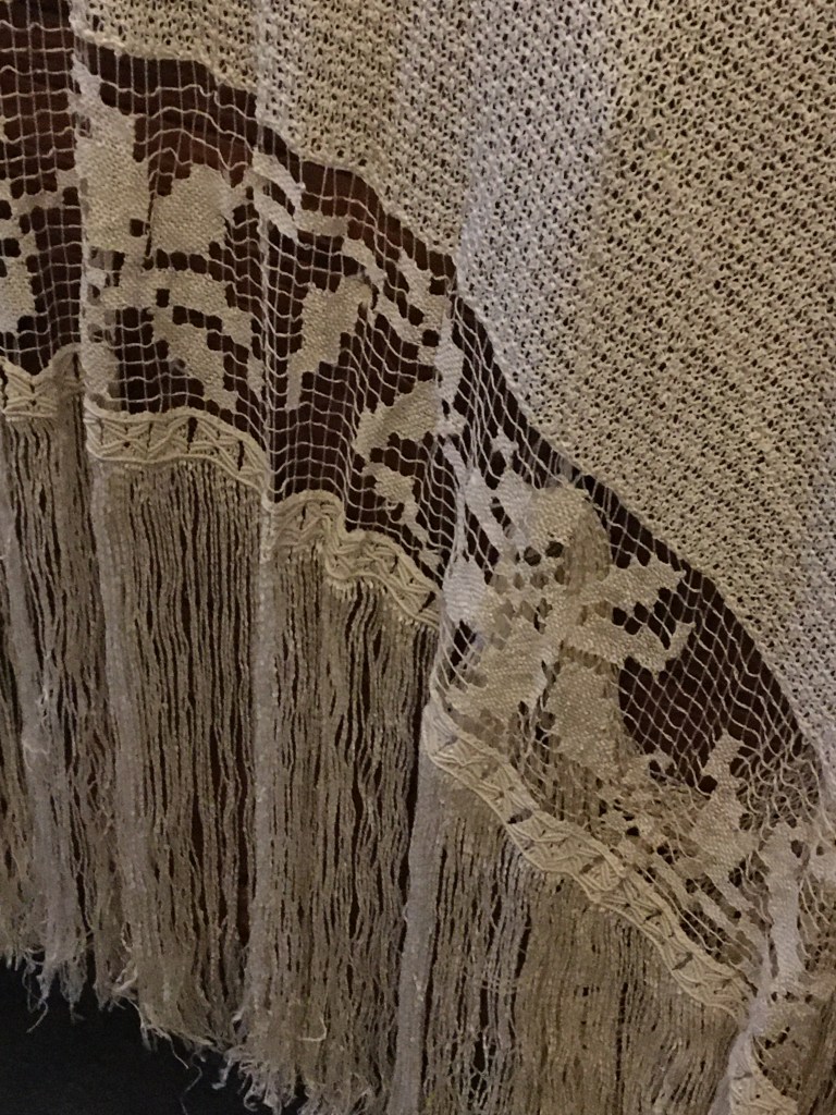 Historically, there is the shawl my mother and father took turns knitting on the steamer coming to the US. It was for my father’s grandmother and I still keep it in my chest although it is no longer usable. The most precious historical shawl I have is the one made by Fernanda, my Bizzarri mother-in-law. At this point certainly over a hundred years ago, it uses three techniques – knitting, crochet, and. . . oh dear, someone help me to come up with the right term. Suddenly, there I have it – macramé.