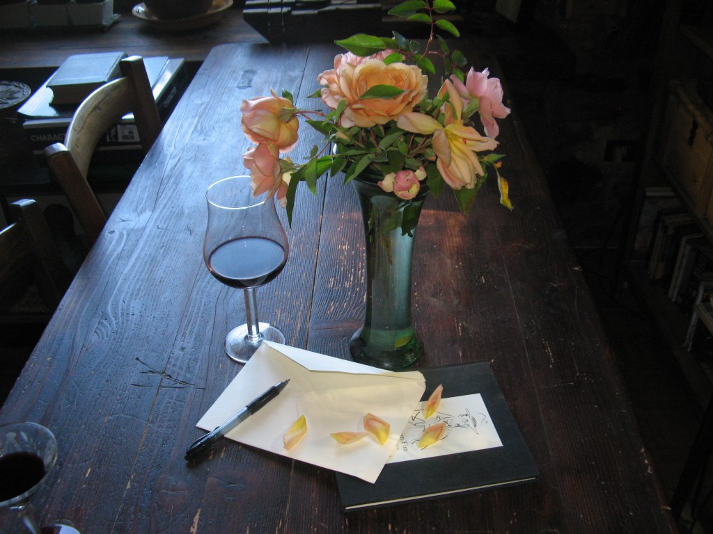 Then there is the flaring rather heavy green glass vase. Probably bought with my husband Mario when we went with a friend, another Mario, to Lucca. Perfect for roses or a branch of peach blossoms. When a friend of mine was writing her “Letters to Men of Letters,” she needed an illustration for Kafka so I put roses and the vase and a letter together in a composition for her, although she didn’t use it.