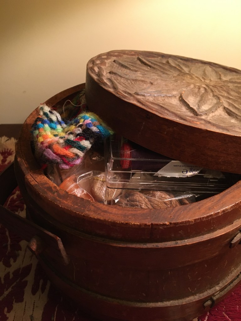 Then there is a round wooden box with a geometric design carved on the lid. Made by my father. The box now holds sewing material, threads and buttons and needles. An awl used by my father probably to mend some kind of net. A braid of multicolored threads, from years and years ago, but still useful when seeking just the right color for a mend. Small containers of buttons, which no one will ever use. Still, here in the apartment that sewing box has shown itself to be particularly useful.