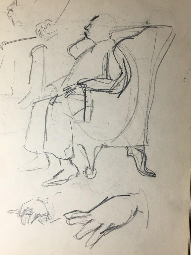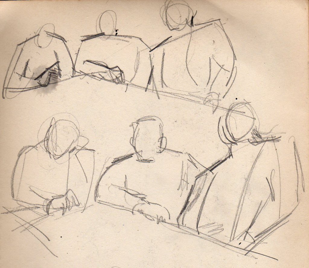 Folding chairs, many already occupied, were scattered around the room. I found a seat and began sketching and taking notes. I drew swiftly and soon had filled several pages of a brown note book, bought in an art shop on West 57th Street, with drawings. A few of these sketches eventually became the inspiration for a painting that reflected the power of the evening.